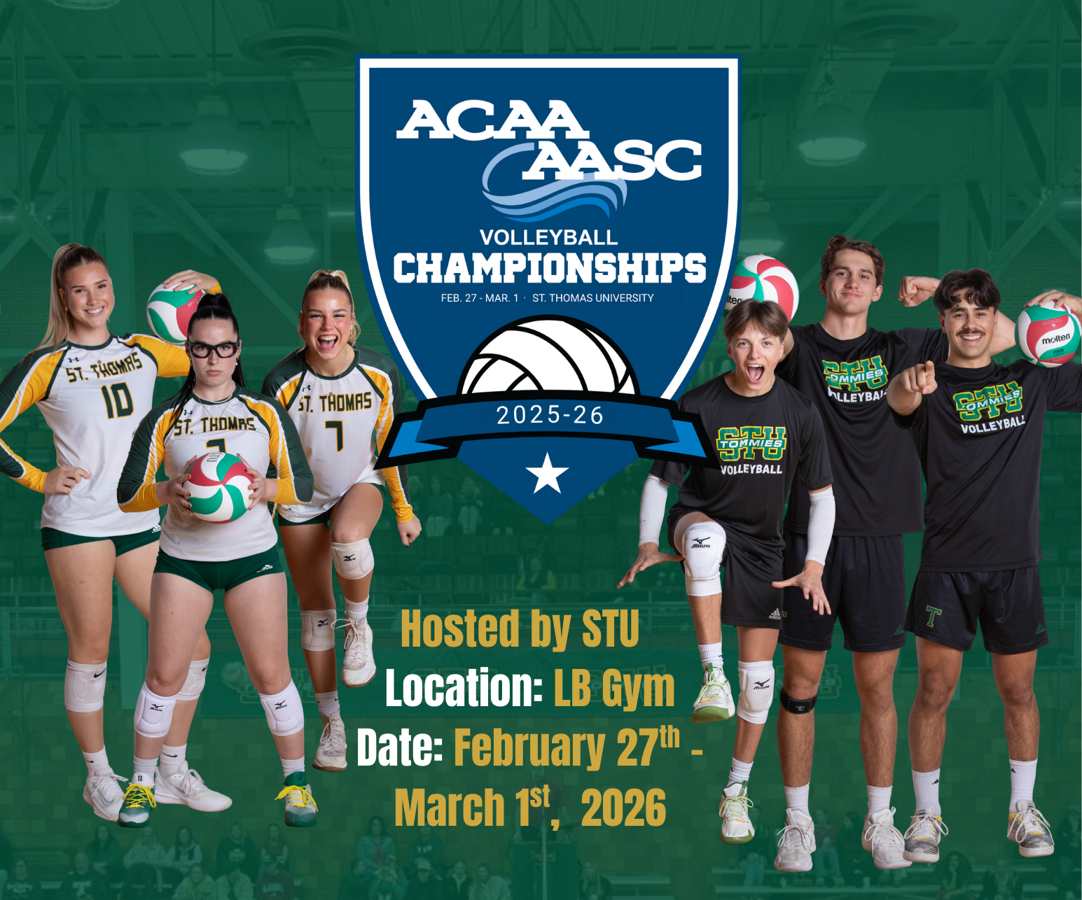 Nous sommes ravis d'annoncer que le département des sports de l'université St. Thomas accueillera cette année Championnats de volleyball de l'ACAA!Les championnats auront lieu vendredi 27 février au dimanche 1er mars, réunissant les meilleures équipes féminines et masculines de l'ACAA à Fredericton, où elles s'affronteront pour avoir la chance de représenter la région de l'Atlantique aux championnats nationaux de l'ACSC de cette année.